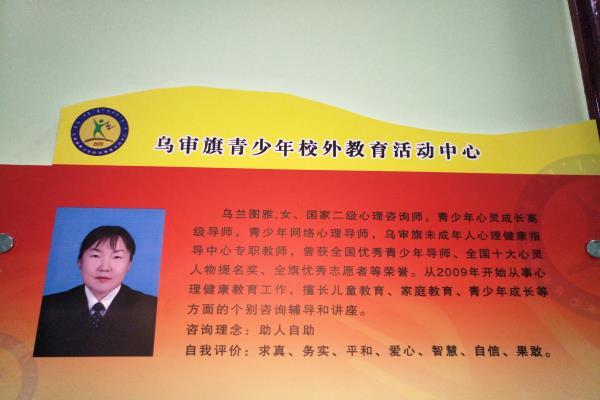 乌审旗未成年人心理健康指导中心成立于2009年3月,是为全旗未成年人健康成长提供心理健康辅导服务的公益性机构。中心依据“尊重理解,保密真诚,助人自助”的原则,给每位来访者一种安心愉悦感。定于每周三至周五定时开放(上午:8:30—11:30 下午2:30—5;30)。除固定值班时间外,如有需要,可以直接找乌兰图雅老师或预约,预约电话:0477-7581475。