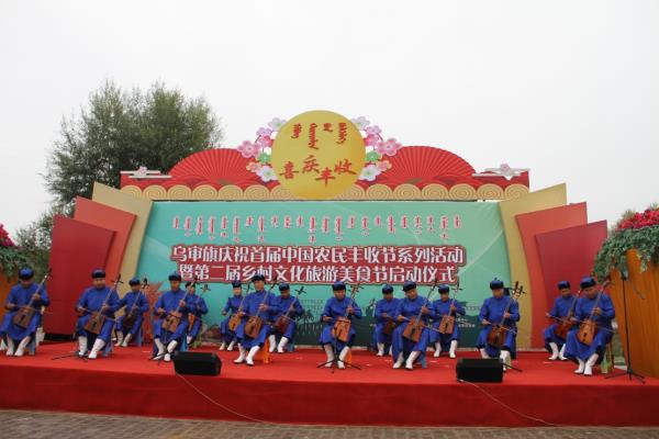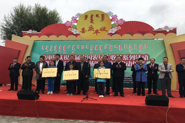 9月19日,在乌审旗庆祝首届中国农民丰收节系列活动暨第二届乡村文化旅游美食节上,旗委书记额登毕力格、旗委副书记、政法委书记苏日嘎拉图和旗委常委、宣传部部长冯志明为我旗3所首批自治区“小小乌兰牧骑”授牌。
